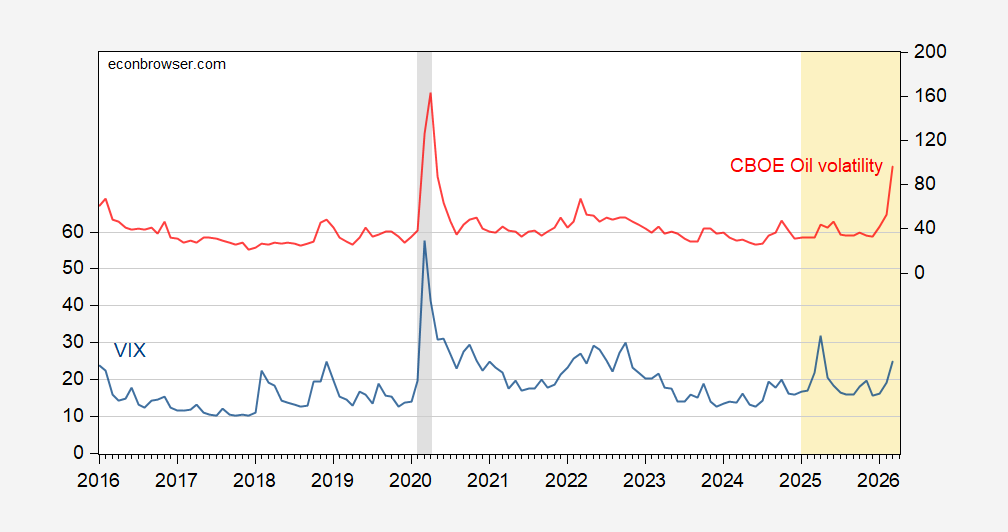 Figura 2: VIX (azul, escala izquierda), volatilidad del ETF de CBOE Oil (rojo, escala derecha). Las fechas de pico a mínimo de la recesión definidas por el NBER están en gris.